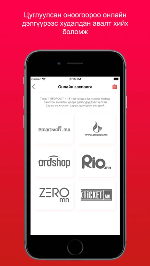 РэдПойнт оноогоо хэрэглэгч зөвхөн аппликейшн ашиглан бүртгүүлэх боломжтой.РэдПойнт аппликейшн дээр бүртгүүлсэн төлбөрийн картаар худалдан авалт хийсэн тохиолдолд бэлэн бус гүйлгээний оноо автоматаар орох болно.