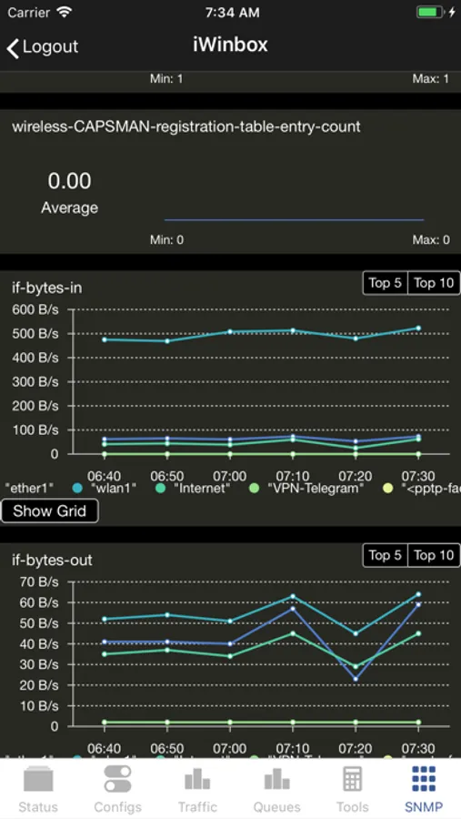 - SNMP monitoring. Resources usage, Interface bytes, queues rates, Hotspot user rates, client count...