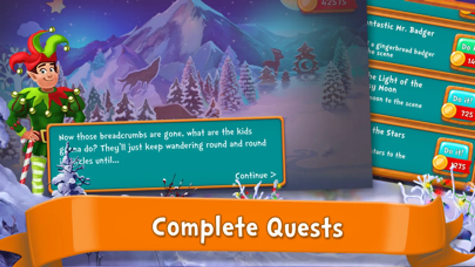 Continue your journey to Elf Town and rebuild it to its former glory. Build houses for elves, factories to produce cookies, toys and souvenirs. Restore post office and train station to send the goods and holiday presents all over the world. Build a cozy little cottage on the hill and a cookie factory - fire up the oven and get baking!