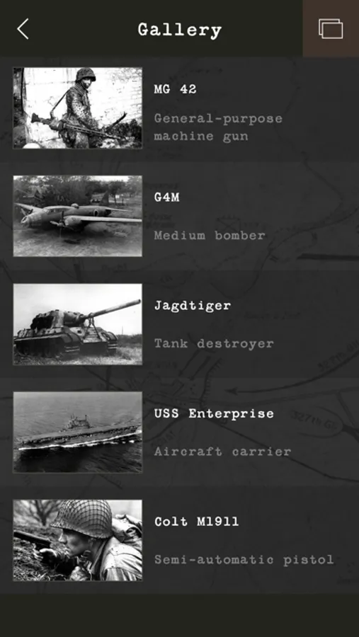 Test your knowledge on World War II weapons. The app includes all the important armoured fighting vehicle, military aircraft, firearm and battleship from each nation which took part in the conflict. Challenge yourself to see how many you can recognize!