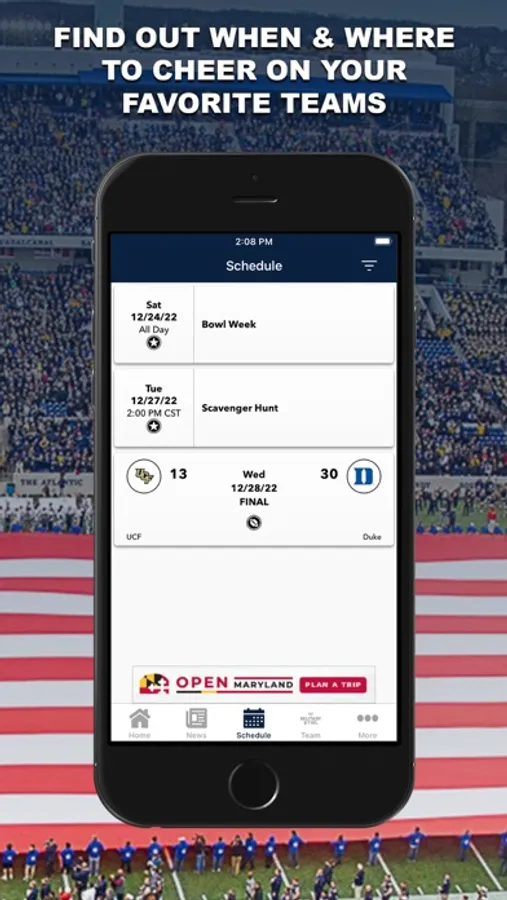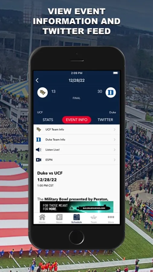 The Official Military Bowl application is a free app that lets you take part in the gameday experience whether you’re at the game or relaxing at home, with great features like: