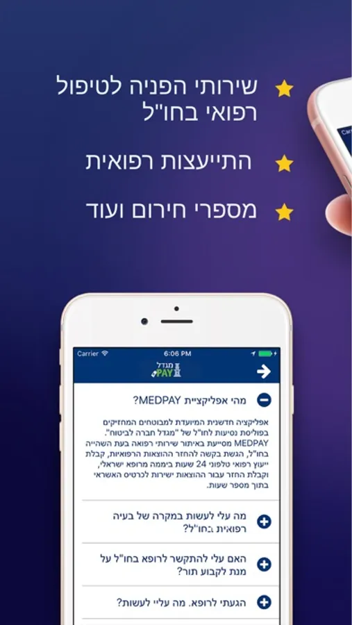 "אפליקצית מדפיי המהפכנית נוצרה על מנת לספק למבוטחי חברות ביטוח שירות תשלום מהיר על הוצאות רפואיות בחו"ל, שירותי הפניה לטיפול רפואי בחו"ל, התייעצות רפואית , מספרי חירום ועוד.