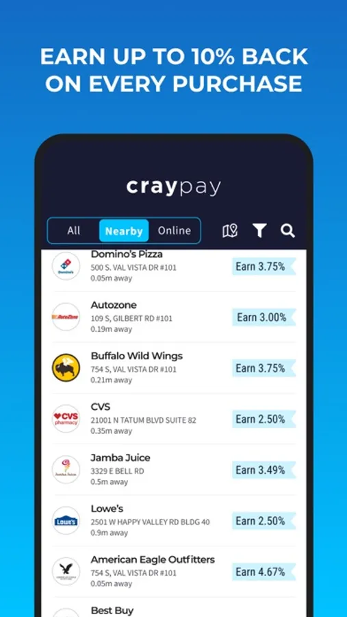 The free CrayPay app lets you instantly earn and save (up to 10%!) with 300 of your favorite brands at over 250,000 locations!