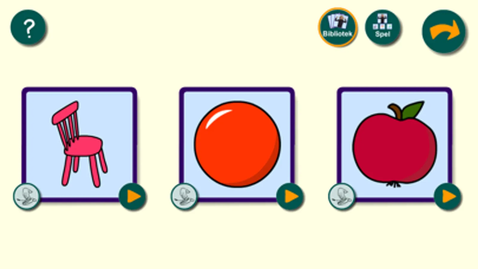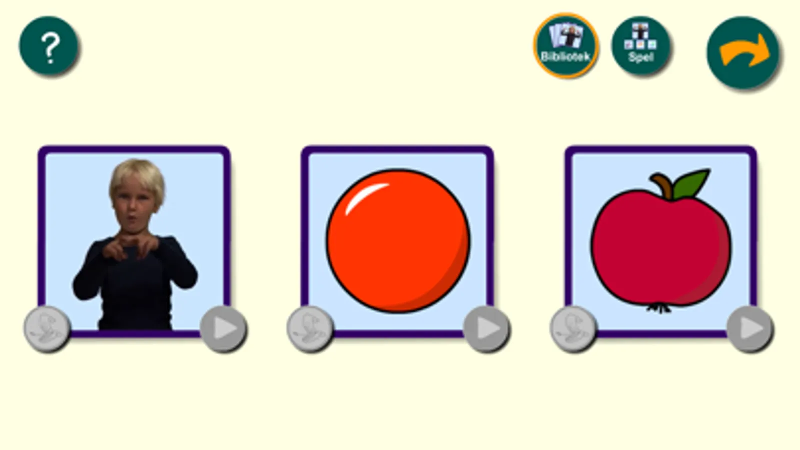 I biblioteket får du utforska teckenspråket genom att välja mellan tre ord. Det är tre kort med ritade bilder som föreställer orden i en viss kategori. En film spelas upp med ett barn som tecknar. Ordet sägs högt som en hjälp till hörande.