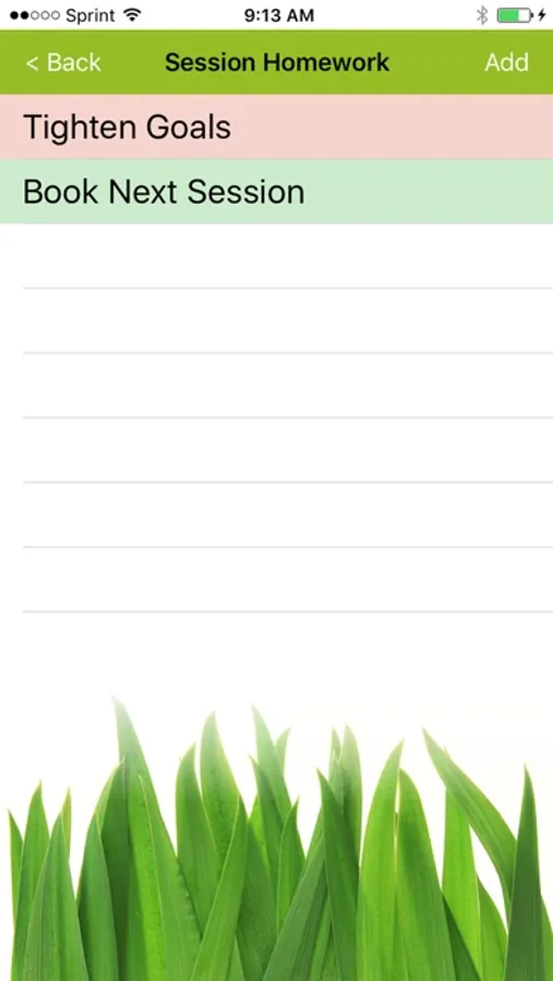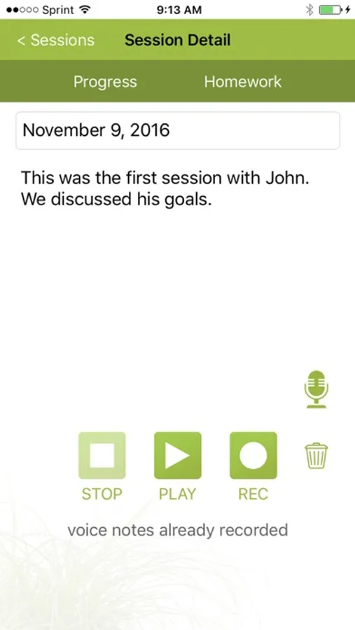 Each client session includes functionality to track and monitor homework assignments, as well as update your client's progress towards achieving his/her goals.