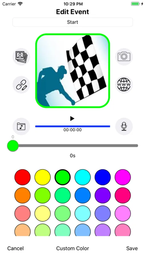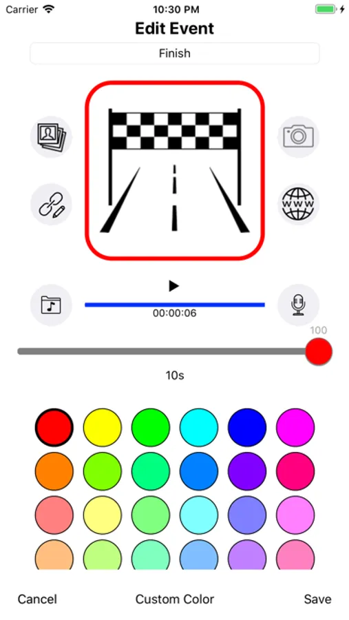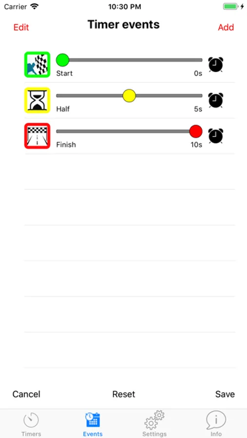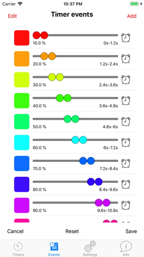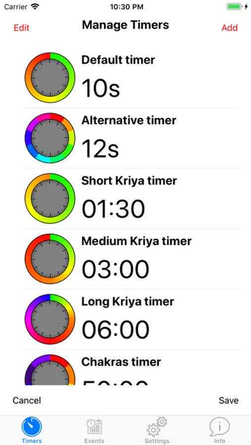 Colored Timer is a configurable timer that changes its background color as time passes. The colors can be defined as "Timer events". Up to three timers can be used at the same time in Colored Timer. Use Colored Timer Pro for up to 10 timers with unlimited colors.