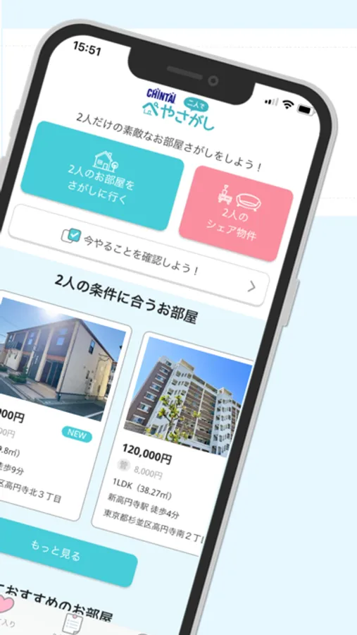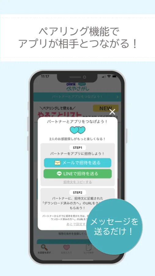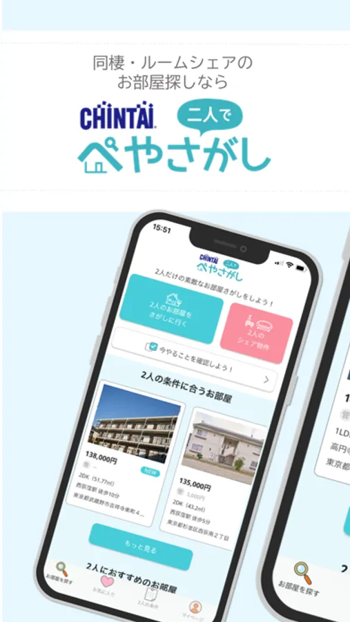 パートナーとつながる「ペアリング機能」で、彼氏彼女の同棲や友達とのルームシェアなど”2人で”賃貸物件検索ができる便利なアプリです。