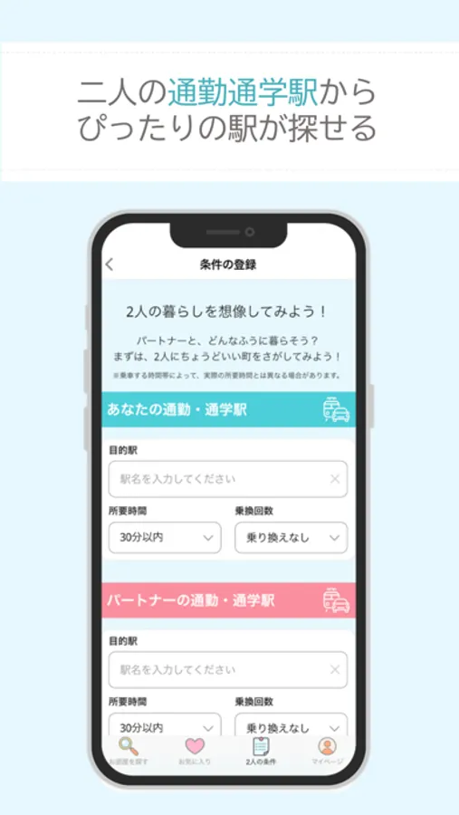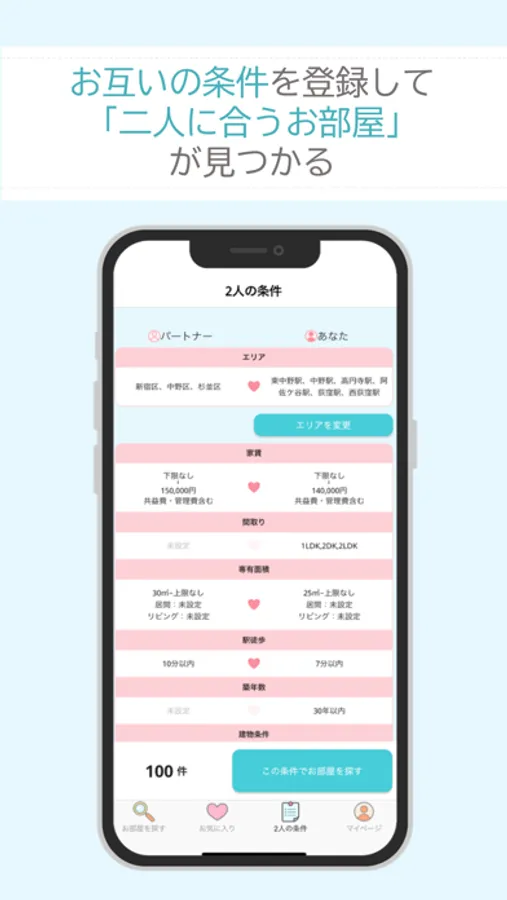 条件を事前にすり合わせなくても、二人の条件をに沿った物件を検索することができます。