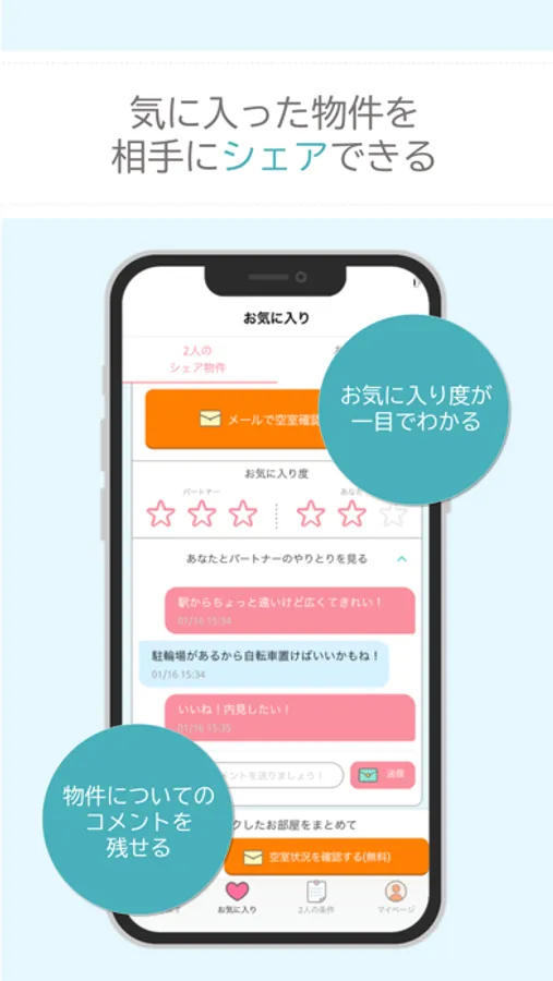 3:気に入った物件はお気に入り度とコメントをつけてパートナーにシェア!