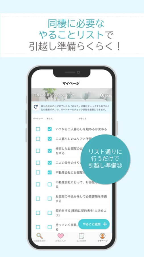 パートナーと「二人暮らしスタートまでのやることリスト」を共有できます。進捗状況を簡単にチェックできるので同棲準備もスムーズに。
