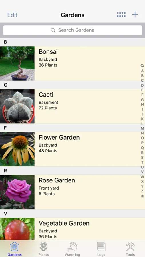 - Organize plants by garden, name, or species.