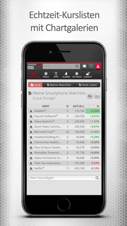 + Automatisch sortierende Listen mit Echtzeit-Aktienkursen.