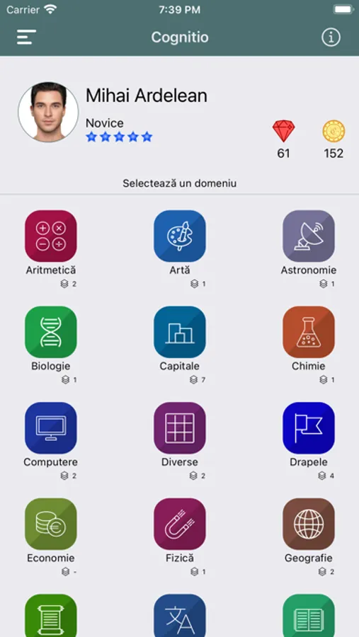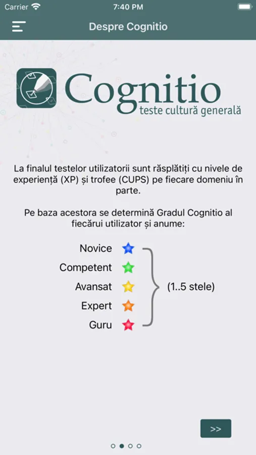 Cu cât joci mai mult și cu parteneri mai valoroși, cu atât Gradul Cognitio este mai mare. Pentru a beneficia de toate opțiunile aplicației te invităm să te loghezi cu un cont Facebook. Ulterior, dacă vei dori, vei putea împărtăși prietenilor tăi progresul realizat.