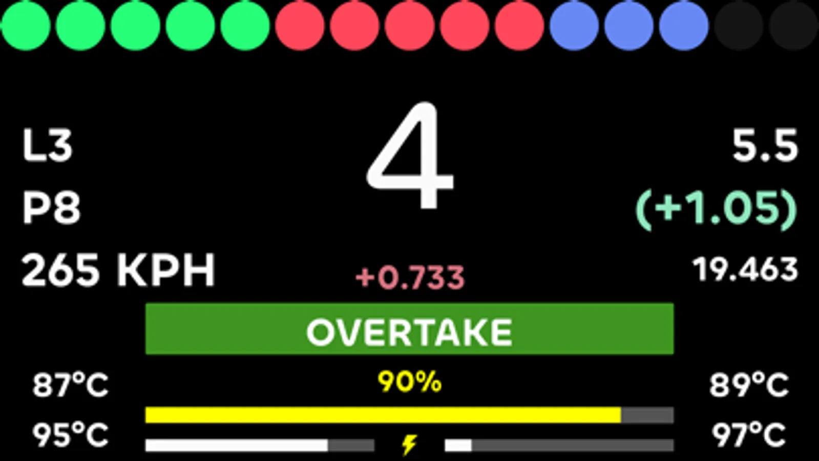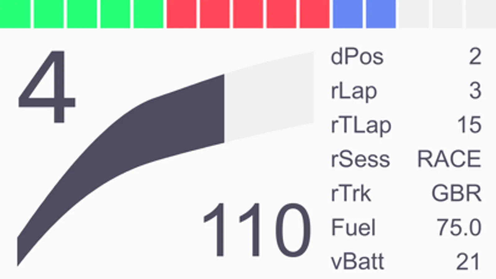 Display key data such as speed, gear, RPM, fuel level, ERS, laptime and lap delta. The RPM lights are customisable to suit your preference and the whole display can flash at the gear shift point.