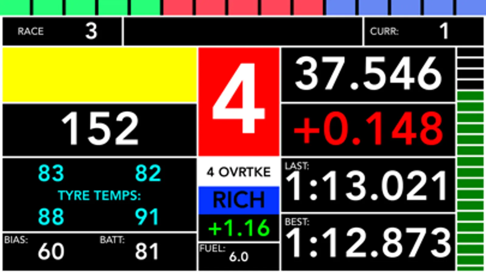 Laptime and fuel usage history are available on a popup screen on the LCD dashboards to help with those long practice sessions.