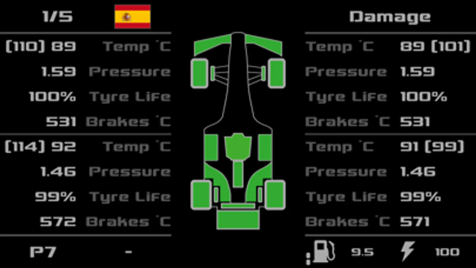 The F1 2016, F1 2017, F1 2018, F1 2019, F1 2020, F1 2021, F1 22, F1 23, PCARS or PCARS2 games are required on either PC, PlayStation or Xbox, or Forza Motorsport 7, Forza Horizon 4 or Forza Horizon 5 on PC or Xbox, or Assetto Corsa game on PC or PlayStation, or GTS, GT7 on PlayStation. This app requires the UDP telemetry mode to be enabled in the game - instructions for enabling this are provided.