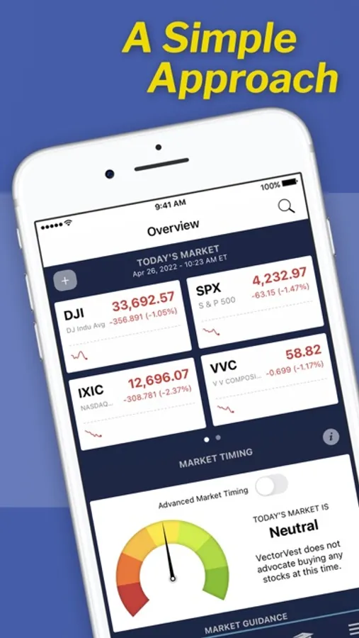 It’s not just what you buy, it’s when you buy. VectorVest’s 30-year history as a leader in the financial industry has resulted in a real-world tested and proven Market Timing System that is unlike any other. Instead of the wild, ratings-driven predictions spouted by “experts,” you get simple and effective, rule-based signals that help you keep your portfolio on the right side of the market. Whether you are aggressive, prudent or conservative, there is a timing system for you. Get timing alerts on your mobile device, check the dial gauge for current signals, and check historical performance for your favorite timing system. The Market Timing Gauge gives you an at-a-glance summary that shows you when to buy…and when to stop, while in-depth, expert guidance with a personal touch is delivered by VectorVest’s Market Guidance Daily Video Report.