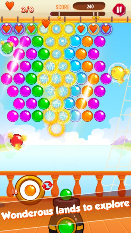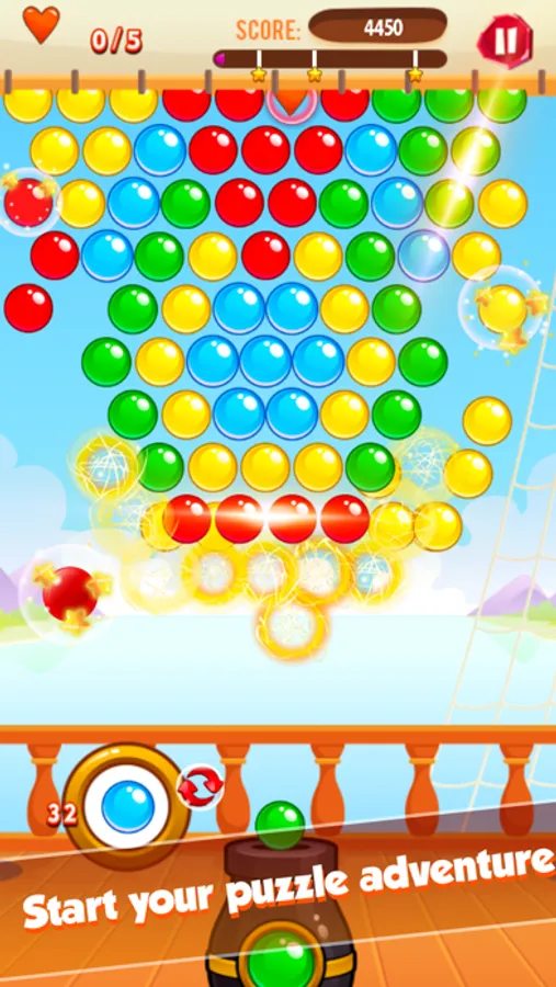 Match 3 or more bubbles of the same color to make them disappear and get score points.