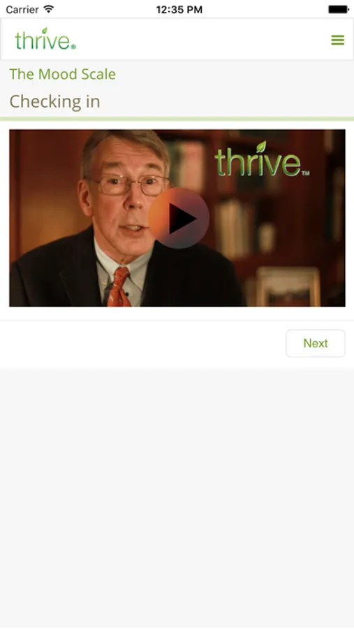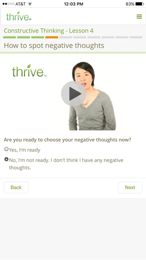 In Thrive, you choose a skill to work on. For example, you can focus on talking to others with more confidence. You can get tips for adding mood-lifting activities to your daily routine. Or, you can learn about viewing life with a clear and constructive outlook. Short videos walk you through the basics. Then Thrive helps you practice and gives you tips to improve.