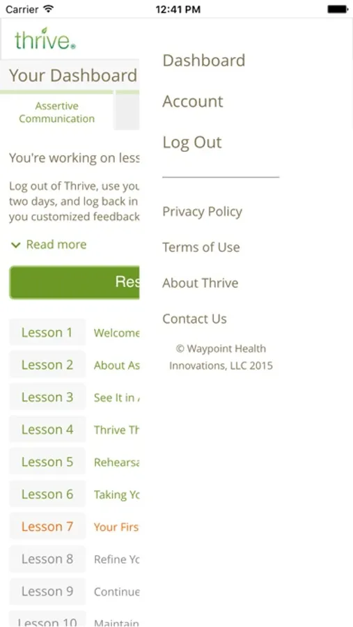 Thrive teaches powerful skills in a straightforward way. Short videos explain each skill and how it may affect your mind and body. You choose which one fits you best. Thrive guides you through each lesson, step by step.