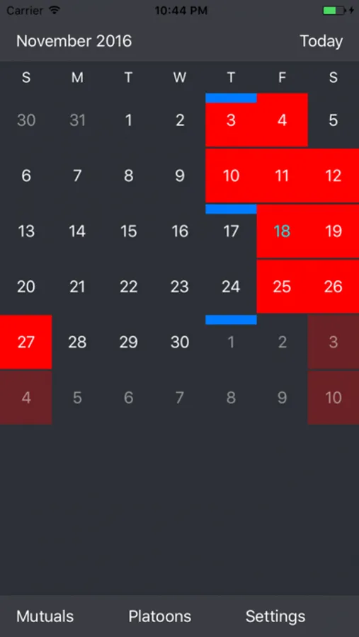 - Easily select your platoon (red days are days off) and add mutuals and off.