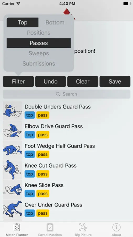 Use the "Match Planner" feature to plot each individual position across an entire match and save it for later. The "Big Picture" feature shows a high-level interactive node map of all positions and their transitions.