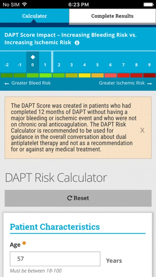 The DAPT Risk Calculator provides decision support for clinicians evaluating the continuation of DAPT therapy for patients at least 12 months post-PCI procedure, and the risk/benefit of continuing or discontinuing DAPT. The App provides a DAPT Risk Score as a numerical value between 0-9 and calculates the % of risk for three end points: stent thrombosis/ myocardial infraction (MI), major adverse cardiovascular and cerebrovascular event (MACCE), and bleeding.
