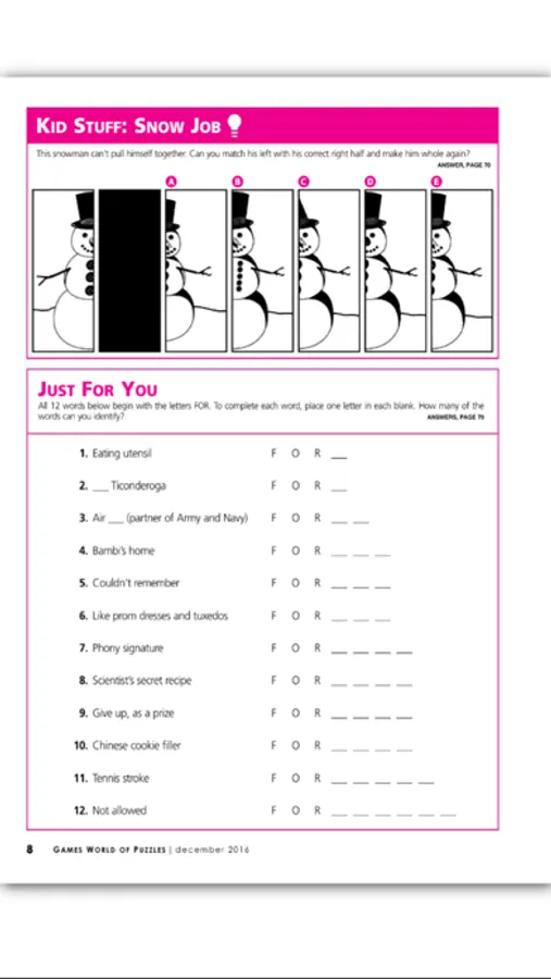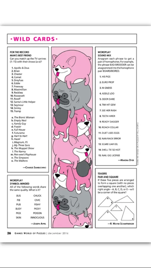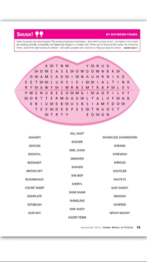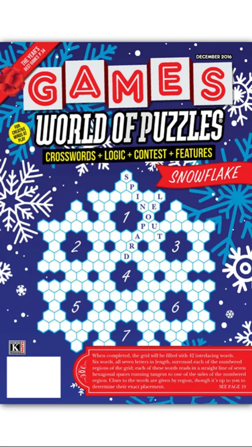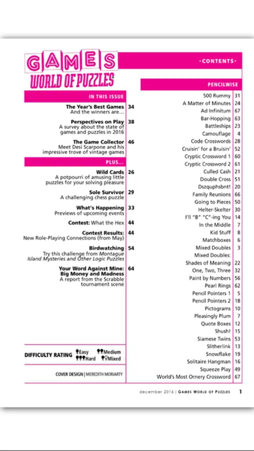 GAMES WORLD OF PUZZLES is a high-level consumer magazine offering a fun and lively mix of word and visual puzzles, brainteasers, crosswords and crossword variants, Paint by Numbers, logic puzzles, and many other diversions for your solving pleasure. Each issue includes reviews of new board games and electronic games, a calendar of upcoming events, and news from the world of games and puzzles. Note: The puzzles are non-interactive.