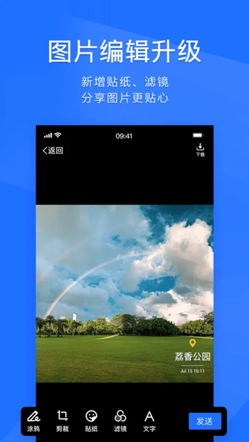 - 10G免费网盘:聊天中收发的文件、本机文件均可轻松保存到网盘,重要文件长期存储,随时查看;