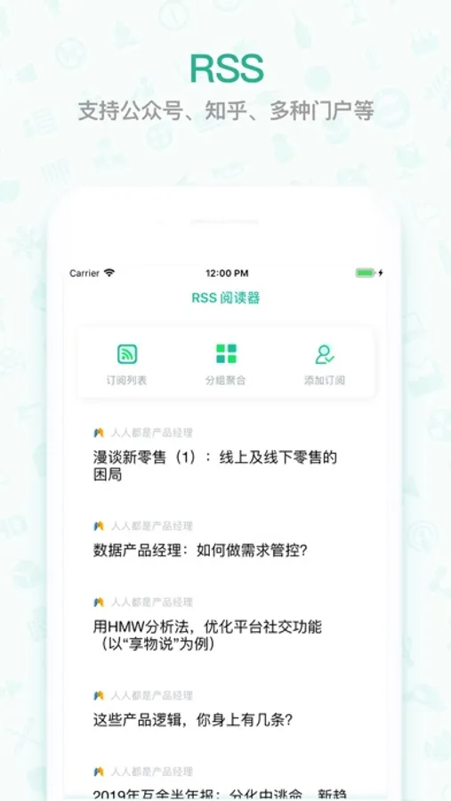 Support RSS subscription through 36Kr, Tiger Sniff, Best App, Everyone is Product Manager, PMCAFF and other mainstream portals, support know-how columns, instant topics, microblogs, Nuggets channels, public numbers, Douban group subscriptions.