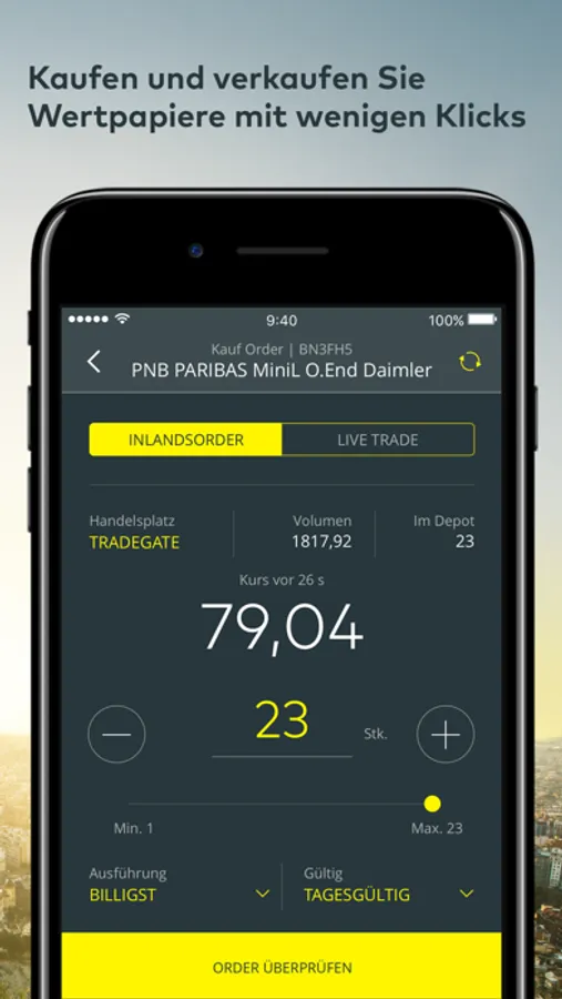 Beobachten Sie die Börse in Echtzeit und finden Sie Aktienkurse und andere Werte im Handumdrehen. Legen Sie persönliche Favoriten fest und bleiben Sie durch Push-Benachrichtigungen für gesetzte Kursalarme auf dem neuesten Stand. Auch aktuelle Börsen-News können Sie jederzeit abrufen. Ihre Depot- und Marktübersicht haben Sie ganz einfach nach Ihren Wünschen konfiguriert. Und zwischendurch können Sie Ihre Werte direkt im Chart analysieren. Der Zeitpunkt zum Handeln ist gekommen? Dann kaufen oder verkaufen Sie Wertpapiere ganz intuitiv mit wenigen Klicks, z. B. im LiveTrading.
