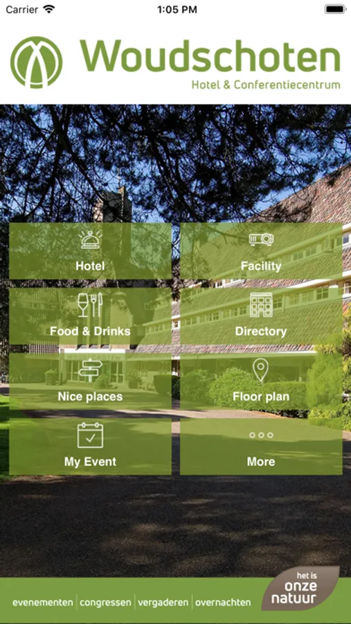 With the Woudschoten app, you have all the information and the latest news from Woudschoten Hotel & Conference Center directly available. In the app you can find information about our location and facilities. On the interactive map you can easily find your room, hotel room or other spaces. If you want a day trip then there are several options in the app with information. Reception can be called with one touch and also your next stay can be directly reserved