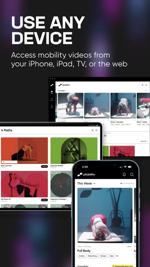 Your pliability account enables access to our full mobility llibrary and allows you to stream videos on your iPhone, iPad, Apple TV, pliability’s website or to any AirPlay-compatible device.