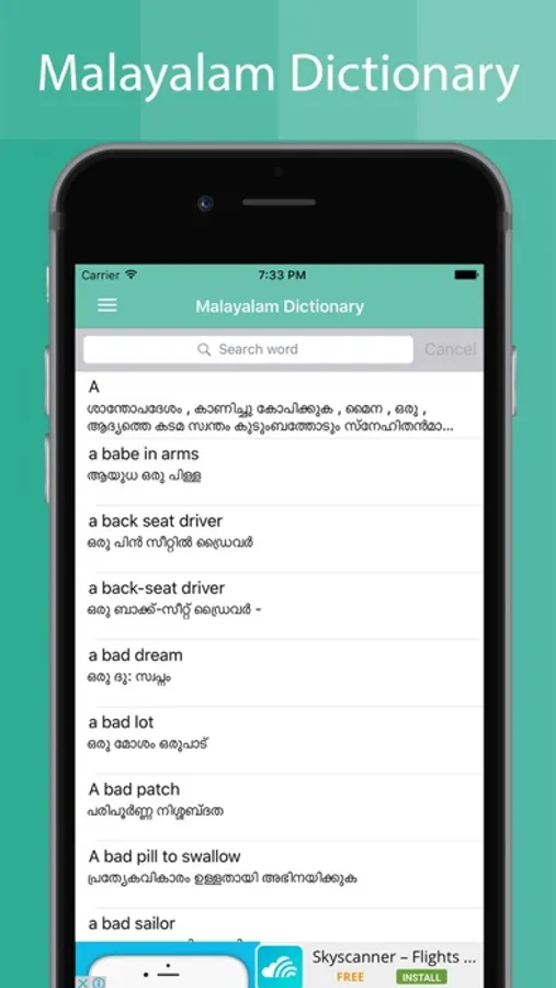 Learn the Malayalam meaning of any English word at the time. This is the ideal and easiest tool to have on you iPhone or iPad. Malayalam Dictionary in iPhone will help you