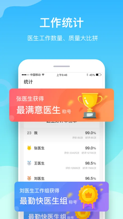8 服务统计榜单:医生、工作组参与服务好评大比拼,争夺“最满意医生”荣誉称号。