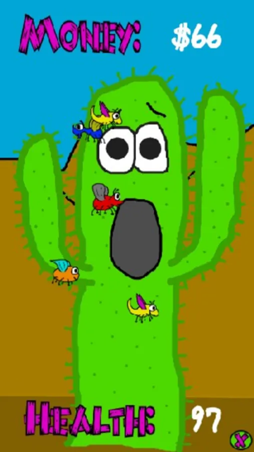 Kill the bugs before they eat the cactus! He's screaming for a reason! SAVE HIM!!! Also, the cactus starts to look more and more hip as you kill bugs and collect money... so that's cool
