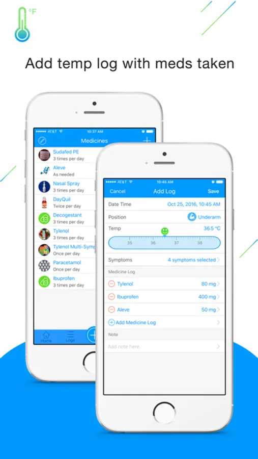 ⁃ Log temperature with time, test position, symptoms, taken medicines and other note text.