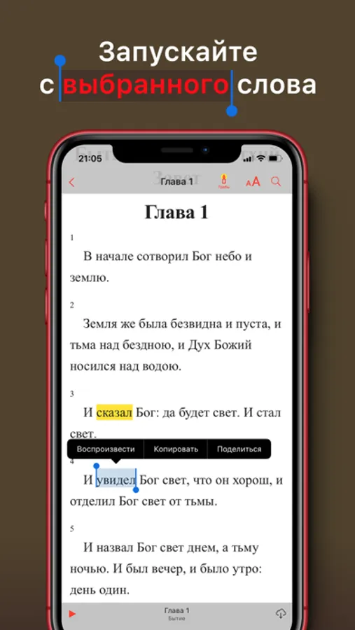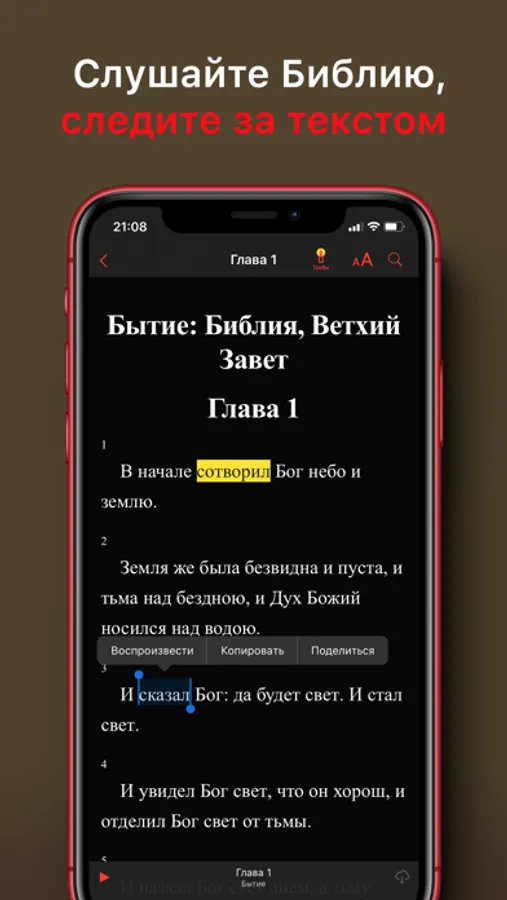 ・ Читаемый текст подсвечивается — возможность слушать и читать одновременно, понимая слова и смысл Священного Писания;