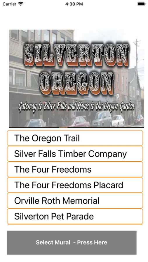This iPhone and iPad application is designed to assist tourists visiting Silverton, Oregon. The app includes a picture of each mural in addition to information about the history of the mural and information about the artist who created the artwork. Map and directions functions and text-to-voice function have been added to take advantage of iPhone/iPad functionality.