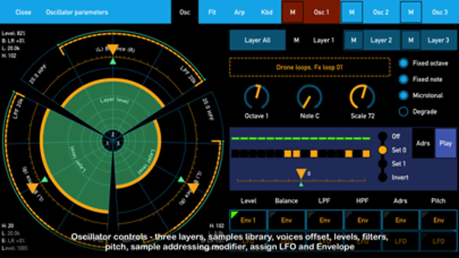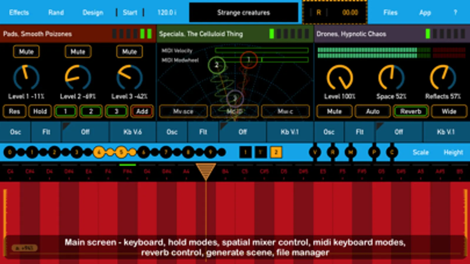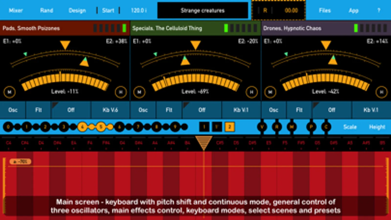 Very flexible settings of each module give you a great opportunity for creating unique and colorful sounding from usual instruments or natural samples and adding automated changes and spatial effects for an endless variations. Different ways of assigning screen and MIDI keyboards to the oscillators provide very advanced features to control the sound. The on-screen keyboard is adapted to create special effects and varying the continuous textures and drones.