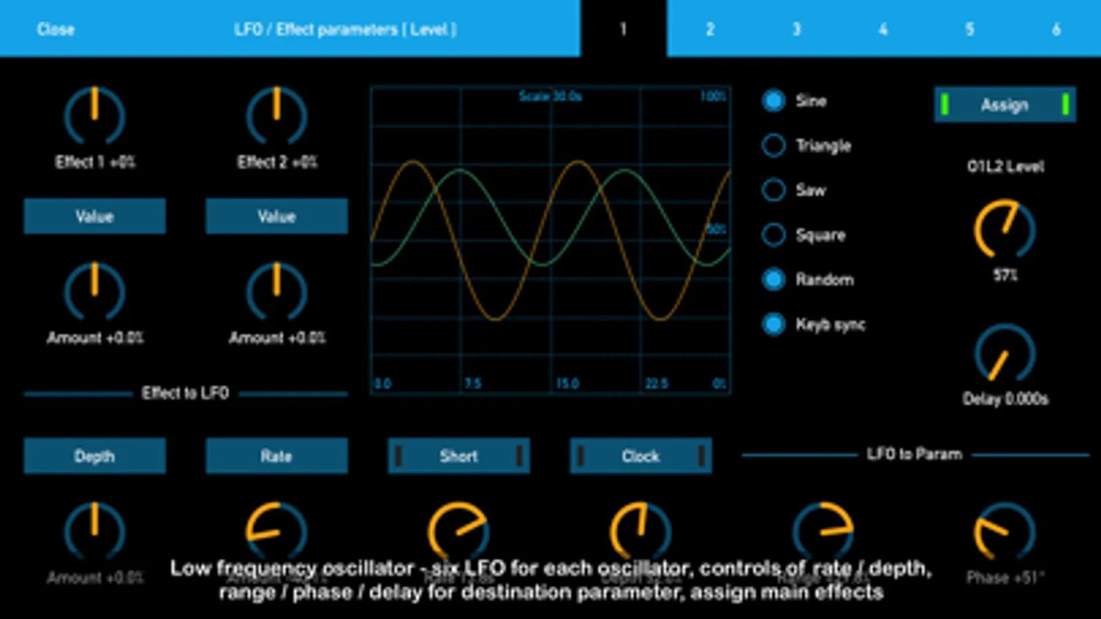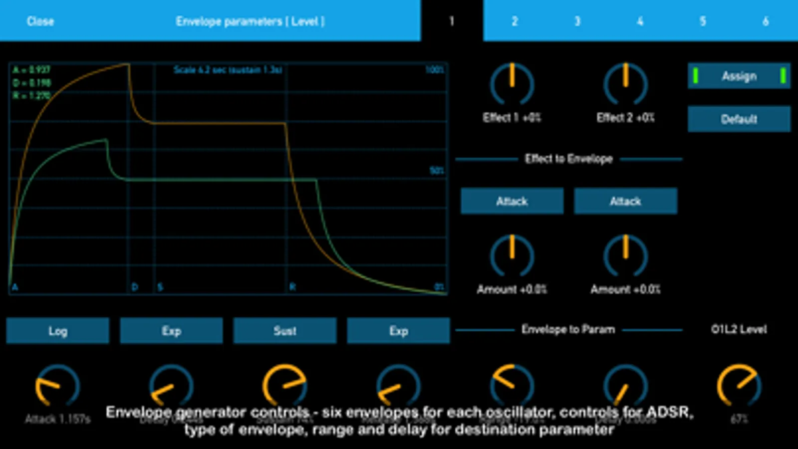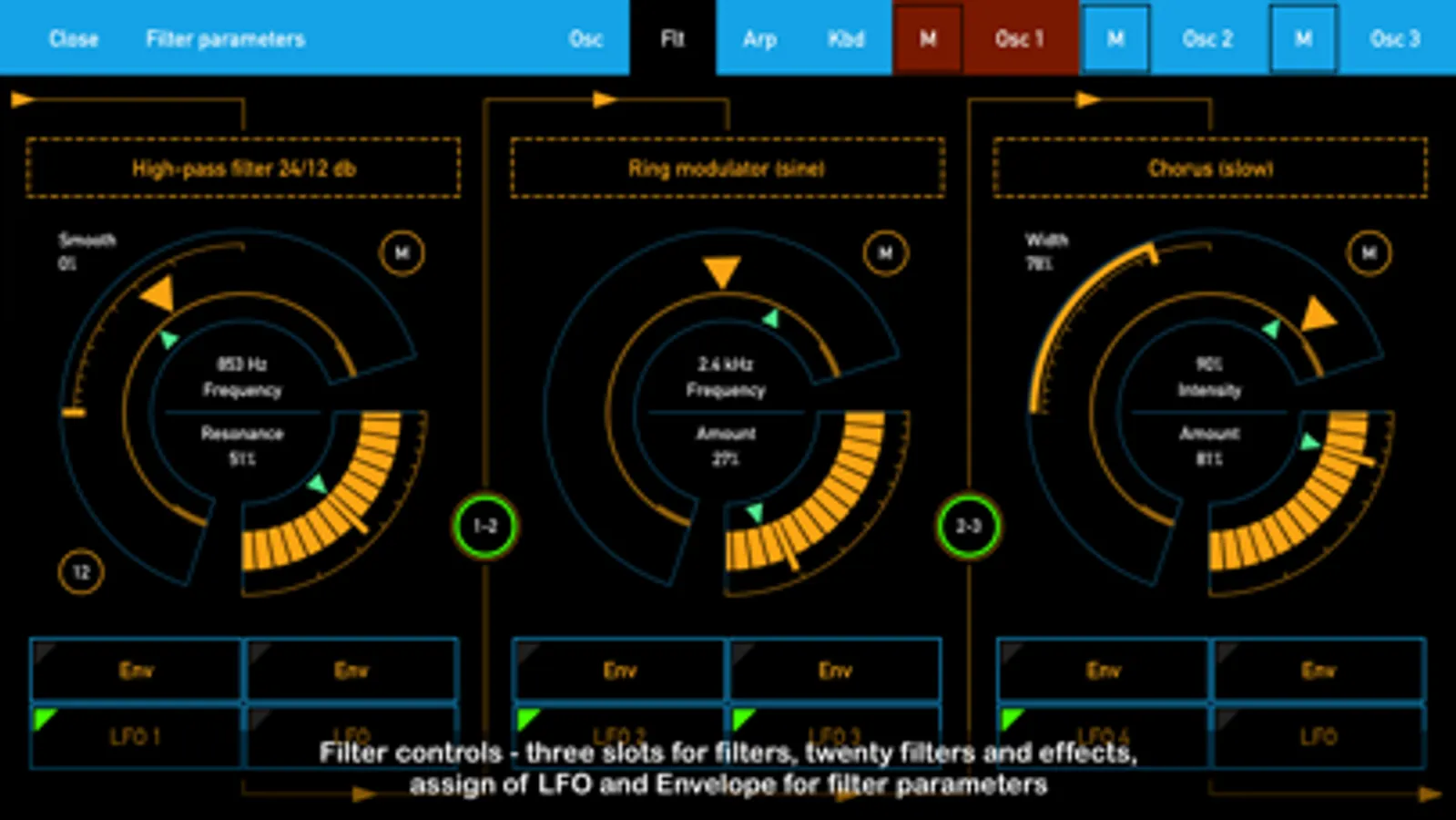 Very flexible settings of each module give you a great opportunity for creating unique and colorful sounding from usual instruments or natural samples and adding automated changes and spatial effects for an endless variations. Different ways of assigning screen and MIDI keyboards to the oscillators provide very advanced features to control the sound. The on-screen keyboard is adapted to create special effects and varying the continuous textures and drones.