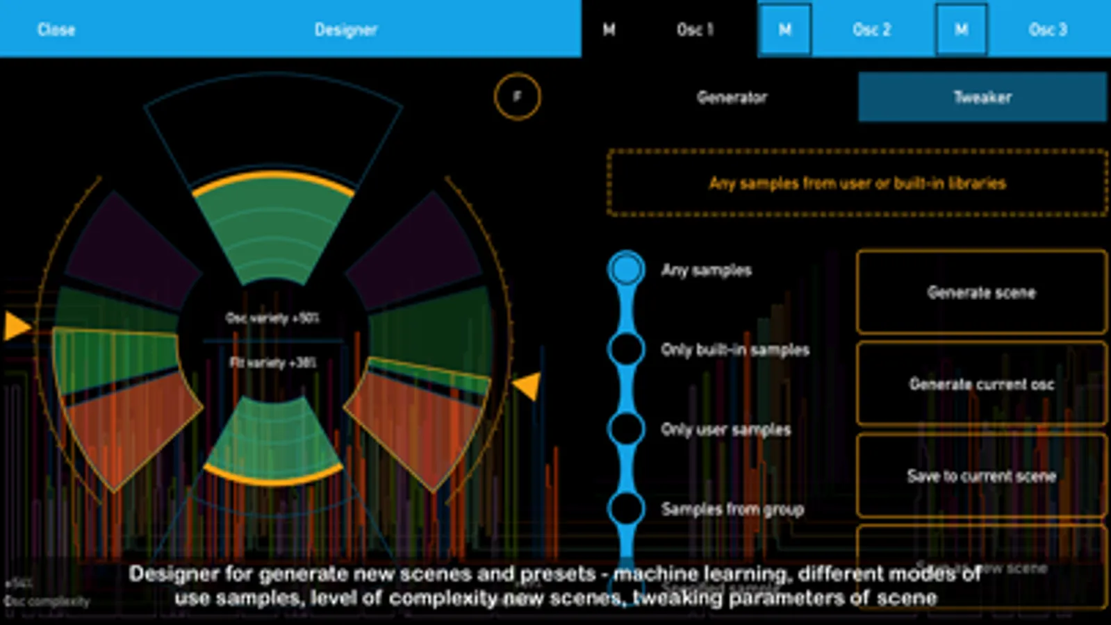 The sound engine of SynthScaper has its own unique sounding differ from any other software synths. You can construct outstanding melodic pads or atonal soundscapes from different kind of built-in or downloaded samples by using all power of multi-layered oscillators, chains of filters and effects, envelope generators and low frequency oscillators. Or you can create your own sound scenes combining oscillators presets from build-in library. Or just use predefined scenes.