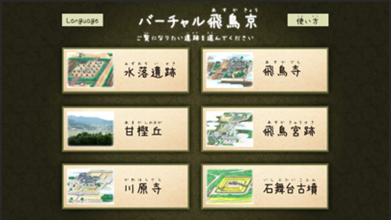 Virtual Asukakyo is a virtual tour app for Asuka-mura in Nara prefecture, which was once flourished as an ancient capital city of Japan called Asukakyo.