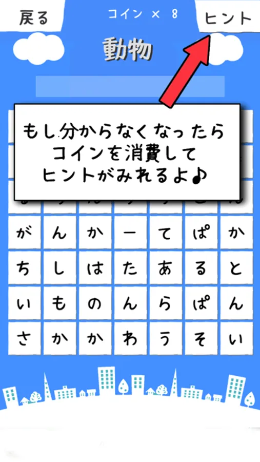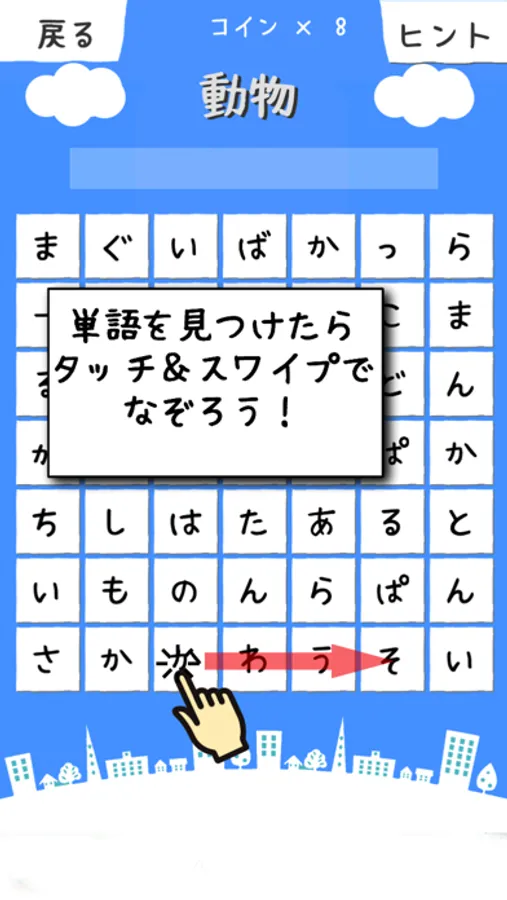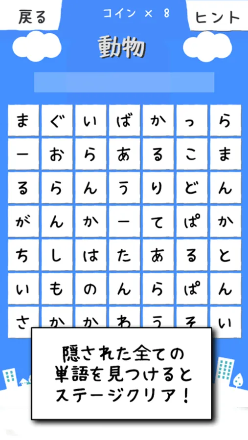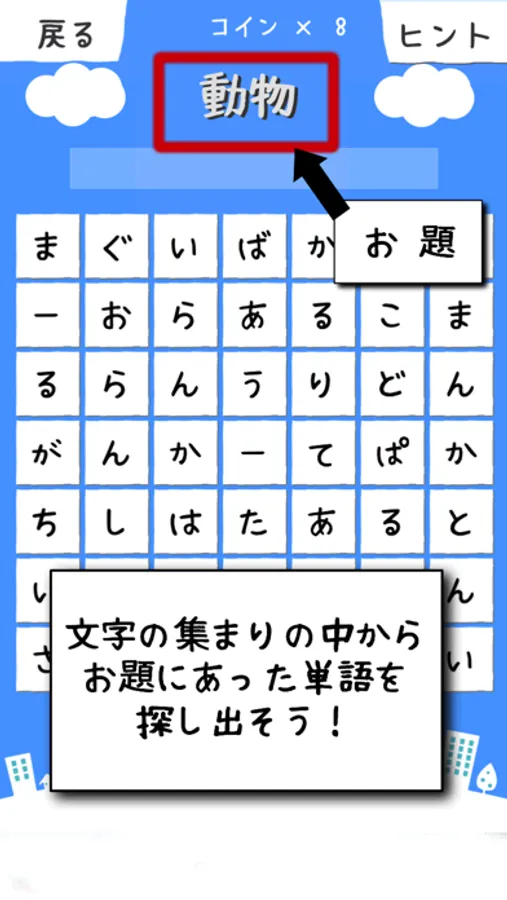 沢山並んだ文字の中から画面上部のお題と関係のある言葉をさがしだそう!!
