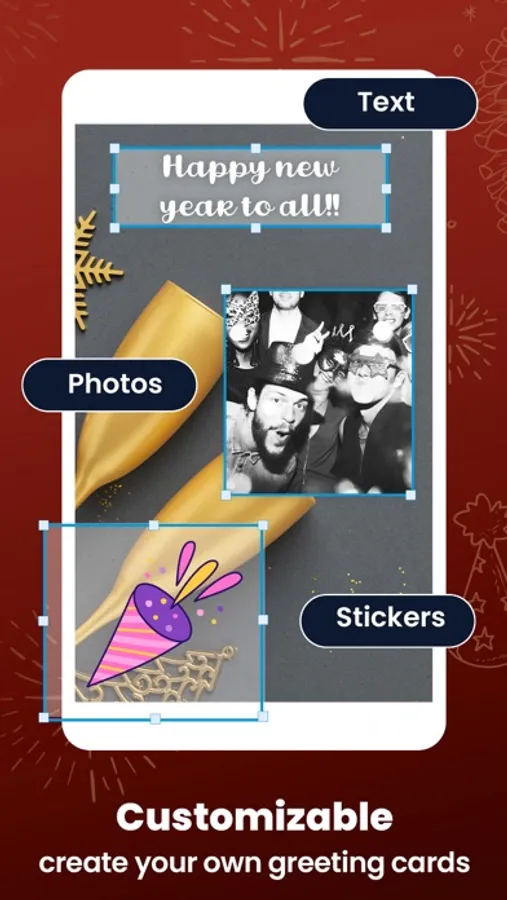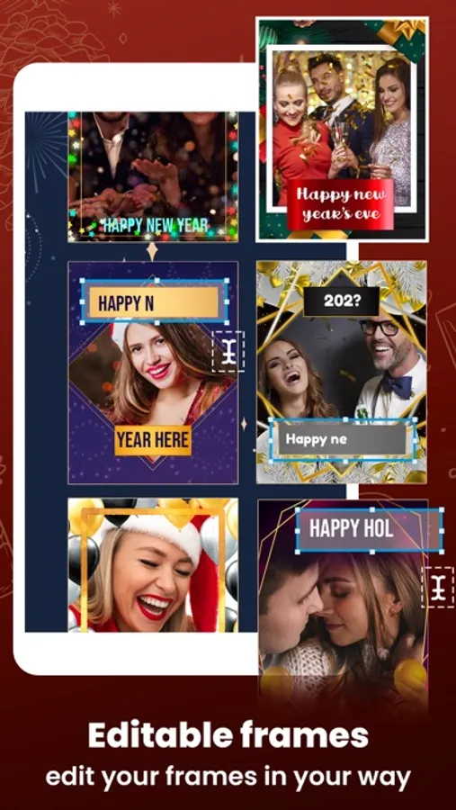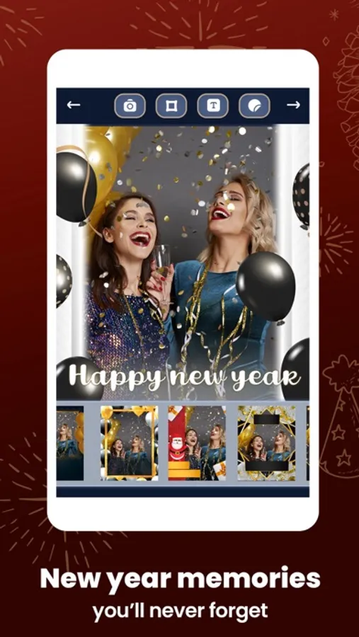 A fun framing app with a photo editor tool to create happy New Year greeting cards and add text to write messages in your own style.
