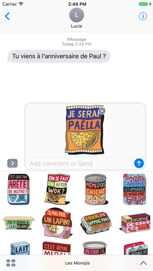 - Les Monojis devraient s’afficher, et vous pouvez naviguer entre les différents packs d’autocollants que vous avez installé en swipant de gauche à droite