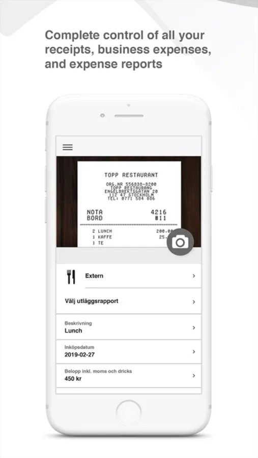 Email receipts are sent on to inbox@modernutlagg.se but Modern Utlagg & Resa also supports digital receipts that are sent directly from the store. Paper receipts are easily photographed and added manually in the app.