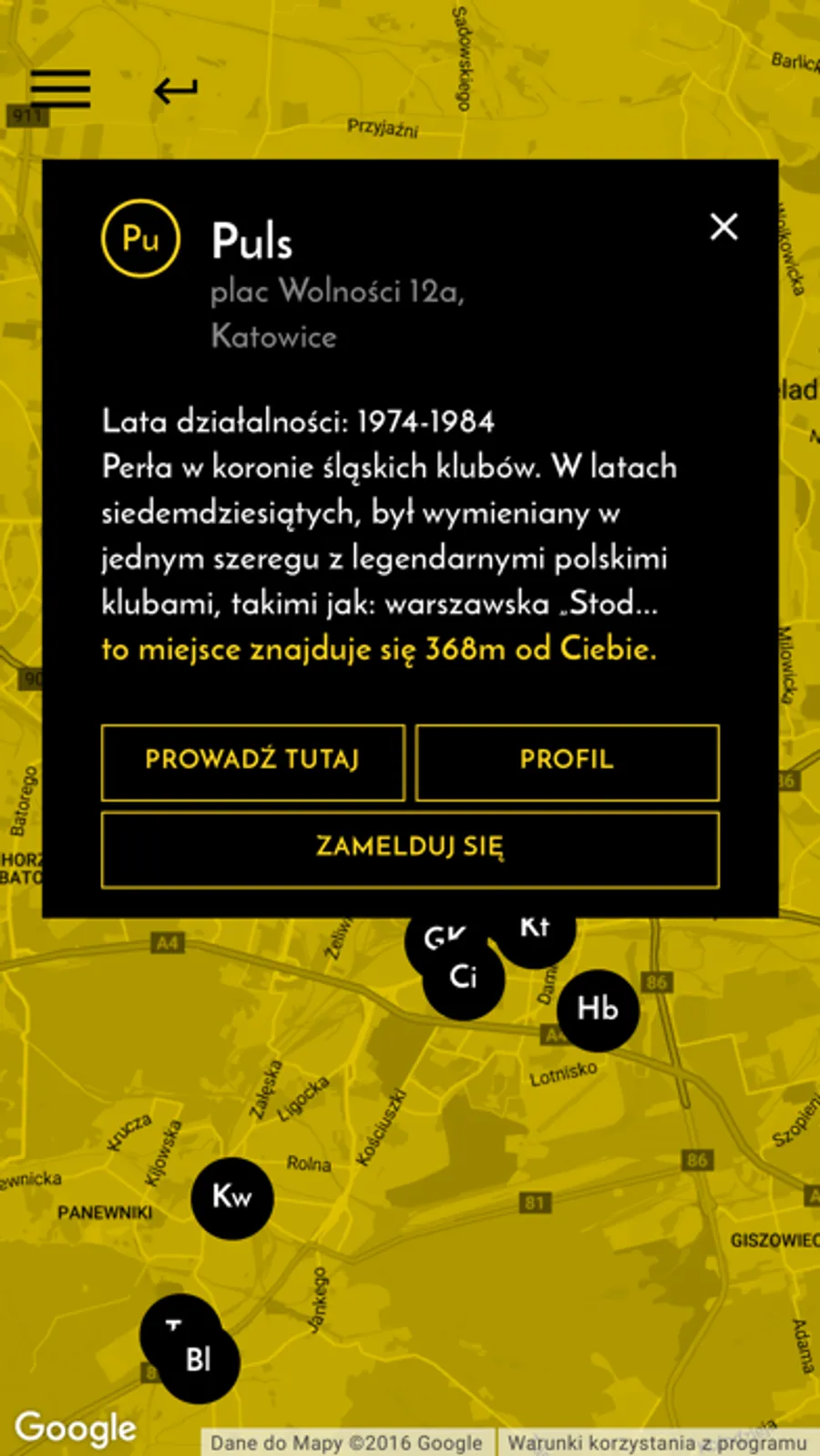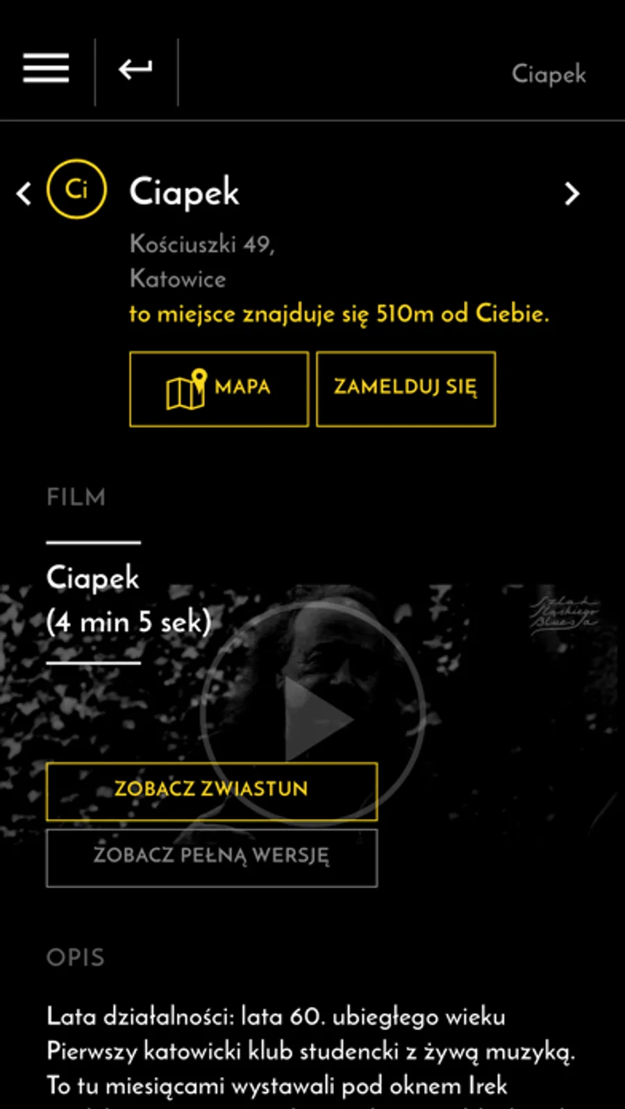Na SZLAK ŚLĄSKIEGO BLUESA składa się kilkanaście miejsc w Katowicach. Z aplikacją zaplanujesz trasę zwiedzania i przeczytasz krótką historię wybranego miejsca. Każdy z klubów wspominają na filmach znakomici śląscy muzycy. Dzięki GEOLOKALIZACJI pełne materiały filmowe dostępne są tylko w odwiedzanych miejscach!