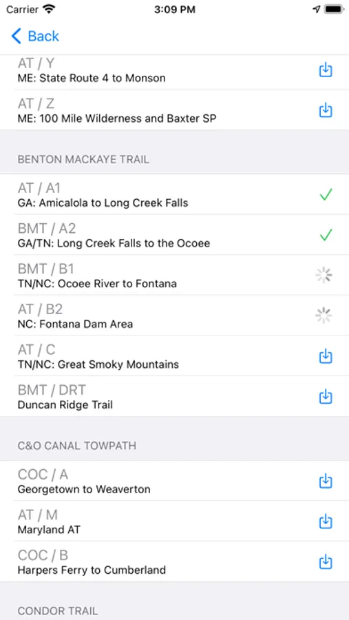 Big Hike provides data on the following trails, free to download: the Appalachian Trail, Long Trail (Vermont), Long Path (New York), C&O Canal Towpath (Maryland), Benton MacKaye, Art Loeb and Pinhoti Trails (North Carolina, Tennessee, Georgia, and Alabama), Condor Trail (California), and many other trails in the Smokies, Catskills, Shenandoah National Park, the White Mountains (New Hampshire), and Baxter State Park (Maine).