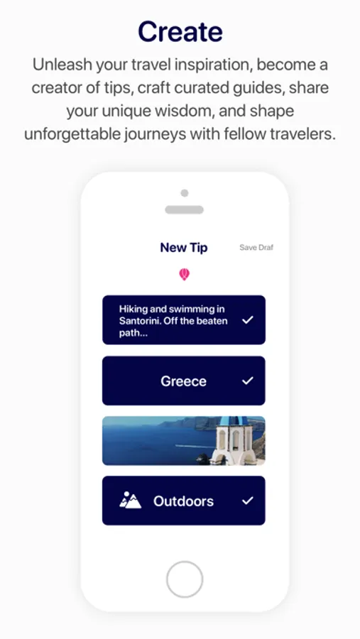 Become an explorer known for your unique experiences. Share your greatest travel insights or insider knowledge as a local expert. Start creating and sharing your own travel tips and guides with the Tiplr community. Invite your travelmate as a co-creator to contribute to your guide. Guide people to off-the-beaten-path destinations and inspire others to embark on unforgettable journeys.